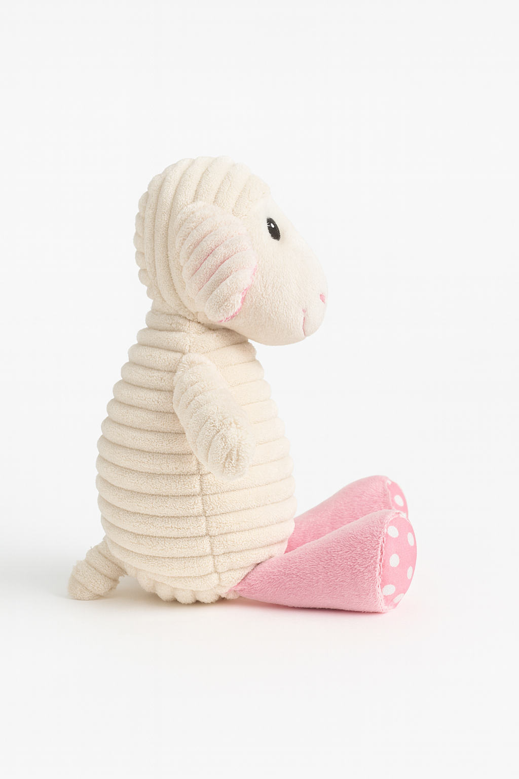 Der Bezug ist per Handwäsche bei 30 °C waschbar, sobald die Füllung entnommen wurde. Mit einer Länge von ca. 27 cm und einem Gewicht von ca. 440 g liegt das Schaf angenehm in der Hand und lädt zum Kuscheln ein.